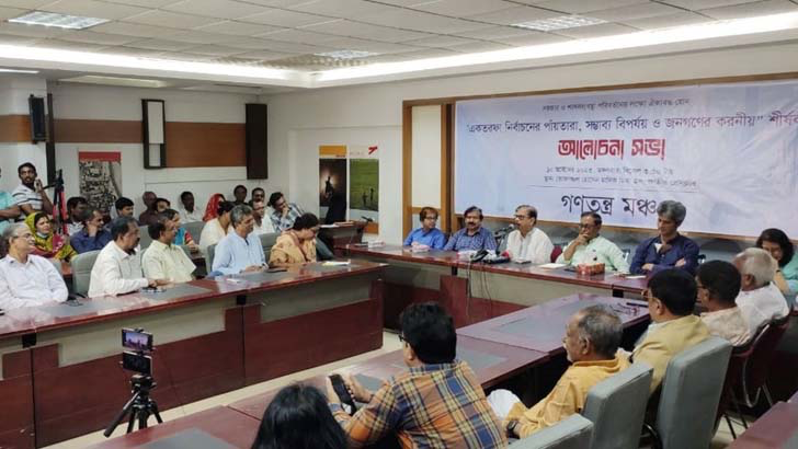 মঙ্গলবার বিকালে রাজধানীর জাতীয় প্রেস ক্লাবে গণতন্ত্র মঞ্চ আয়োজিত ‘একতরফা নির্বাচনের পাঁয়তারা, সম্ভাব্য বিপর্যয় ও জনগণের করণীয়’ শীর্ষক আলোচনা সভায় সভাপতির বক্তব্যে এ কথা বলেছেন গণতন্ত্র মঞ্চের অন্যতম নেতা ও বাংলাদেশের বিপ্লবী ওয়ার্কার্স পার্টির সাধারণ সম্পাদক সাইফুল হক।